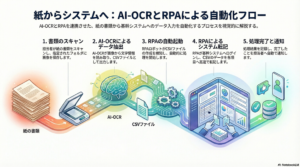 この問題を解決するのが、AI-OCR(人工知能文字認識)とRPAの組み合わせです。AI-OCRは、手書きや非定型フォーマットの文字を高精度でデータ化し、RPAはそのデータをシステムに流し込む自動連携を担います。