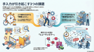 ヒューマンエラー: 入力ミスや転記ミスが避けられず、後の工程での修正コストが発生します。